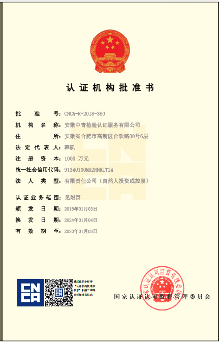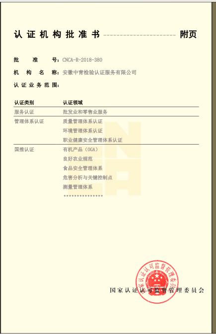 安徽中青檢驗(yàn)認(rèn)證服務(wù)有限公司成立于2017年6月6日,2018年1月3日通過(guò)國(guó)家認(rèn)證認(rèn)可監(jiān)督管理委員會(huì)批準(zhǔn),現(xiàn)認(rèn)證領(lǐng)域:質(zhì)量管理體系、環(huán)境管理體系、職業(yè)健康安全管理體系、食品安全管理體系、HACCP管理體系、有機(jī)產(chǎn)品認(rèn)證、良好農(nóng)業(yè)規(guī)范、服務(wù)體系、醫(yī)療器械質(zhì)量管理體系、企業(yè)誠(chéng)信管理體系、食品工業(yè)企業(yè)誠(chéng)信管理體系、食安安徽品牌等類(lèi)別認(rèn)證。